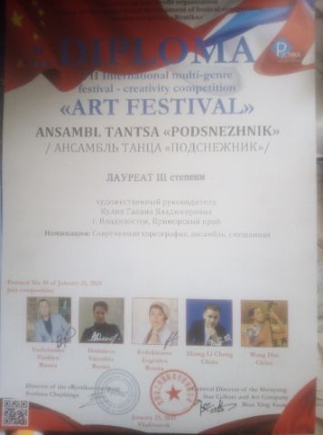 За успешное окончание полугодия выпускного года в направлении классик хорео, историко-бытового танца, нуд контемп, чир джаз и флэш моб дэнс в старшей группе ансамбля танца "Подснежник" "ШОУ БАЛЕТ ФОРСАЖ".